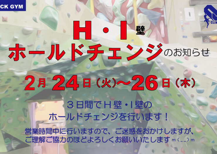 2月24日(火)〜26日(木)の3日間でH・I 壁のホールドチェンジを行います❗️